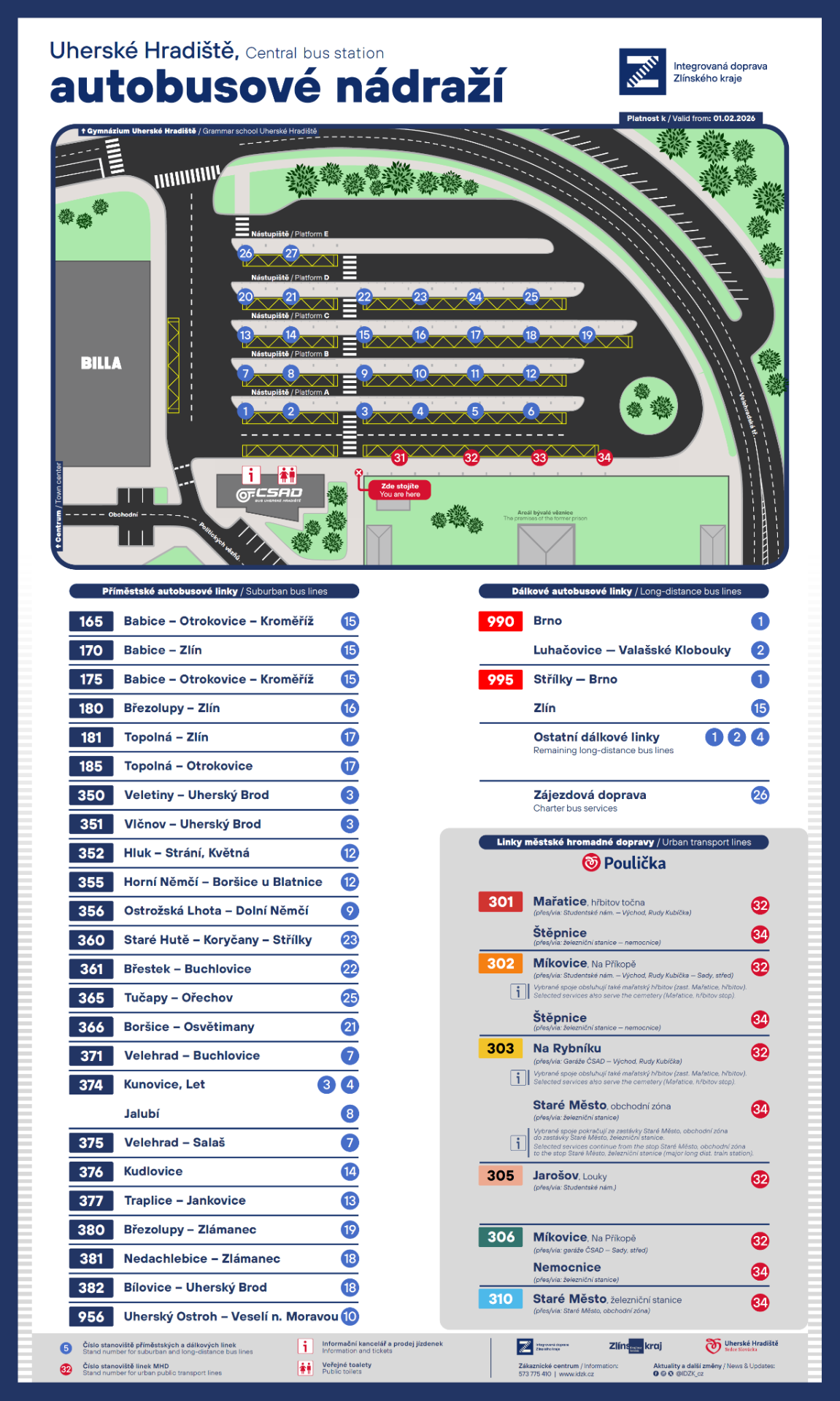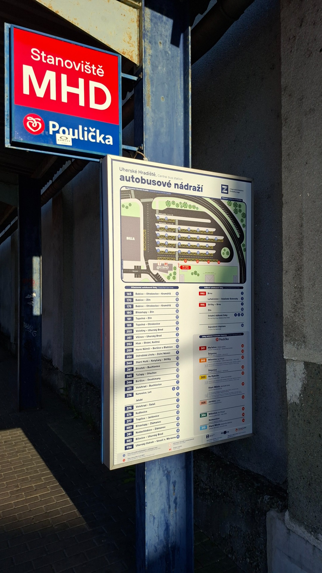 Následovala zpětná vazba od ČSAD BUS Uherské Hradiště jako vlastníka nádraží a zároveň kontrola ze strany KOVEDu. Řešily se nejen obsahové věci, ale i detaily v grafice tak, aby výstup odpovídal reálnému provozu a nevznikly nikde chyby, které by případně mohly zmást cestující. Do toho vstoupil ještě jeden důležitý faktor – plánovaná úprava linkového vedení Pouličky v prosinci 2025. Bylo tedy jasné, že nemá smysl instalovat schéma, které by během pár měsíců přestalo být aktuální.